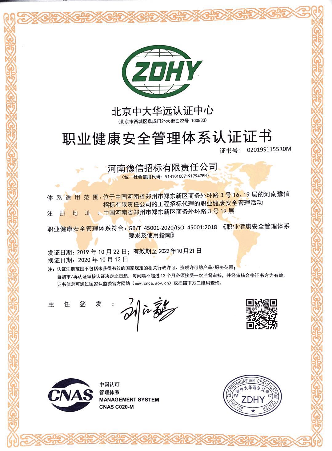 河南豫信招標(biāo)有限責(zé)任公司OHSMSSMS中文證書(shū) -