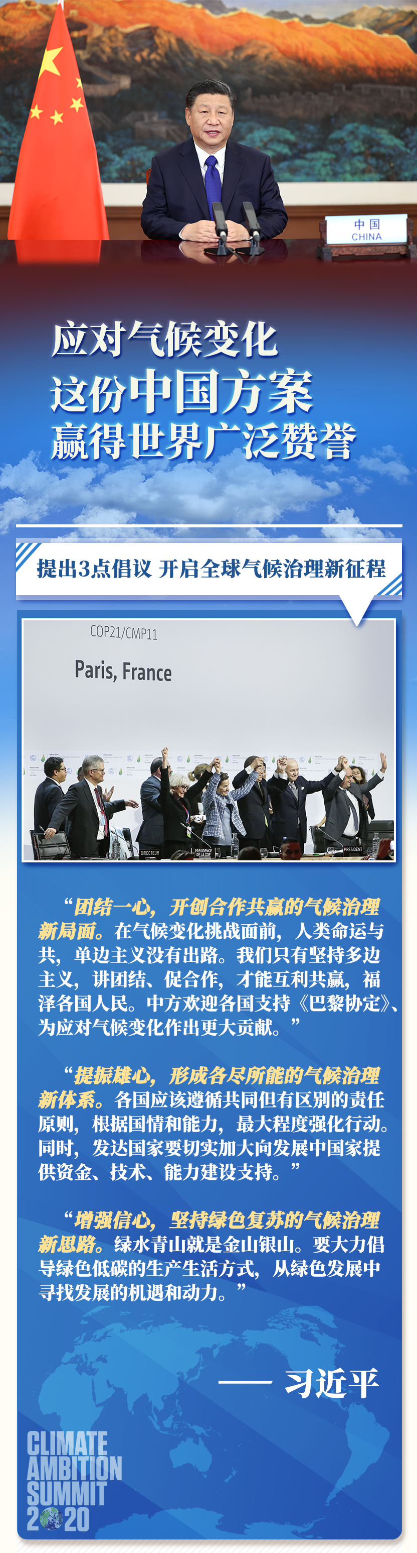 海外各界人士表示,習(xí)主席的重要講話為全球氣候治理提振雄心并提供新思路,彰顯中國與世界各國攜手助力《巴黎協(xié)定》行穩(wěn)致遠(yuǎn)的決心,展現(xiàn)了中國重信守諾、為全球應(yīng)對氣候變化作出更大貢獻(xiàn)的大國擔(dān)當(dāng)。