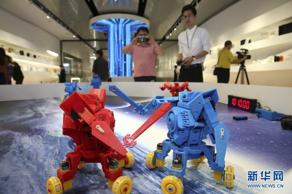 在廣東工業(yè)設(shè)計(jì)城創(chuàng)新科技館,工作人員在展示機(jī)器人“速斗無人區(qū)”(4月19日攝)。新華社記者 殷剛 攝