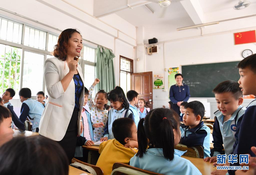 2019年2月20日,米雪梅(左)在中山市沙溪鎮(zhèn)虎遜小學(xué)調(diào)研時(shí)與小學(xué)生交流。新華社記者 劉大偉 攝