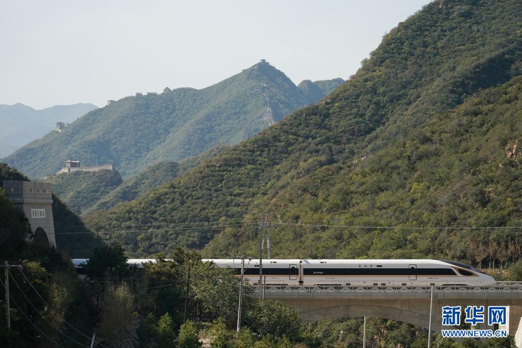 一列復(fù)興號(hào)高鐵列車(chē)從京張高鐵駛過(guò)居庸關(guān)長(zhǎng)城(2020年10月6日攝)。新華社記者 鞠煥宗 攝