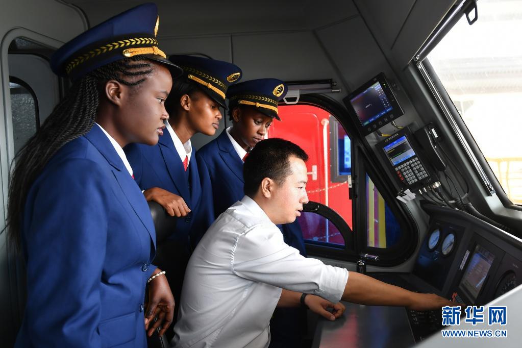 在肯尼亞內(nèi)羅畢,肯尼亞火車(chē)司機(jī)跟隨中國(guó)老師張程熟悉操作流程(2017年5月17日攝)。新華社記者 孫瑞博 攝
