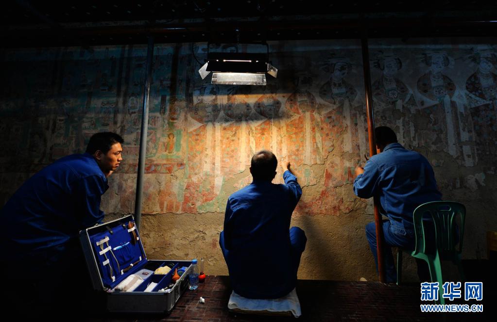敦煌研究院技術(shù)人員在莫高窟98窟內(nèi)對(duì)病害壁畫進(jìn)行修復(fù)(2014年9月3日攝)。新華社記者 陳斌 攝