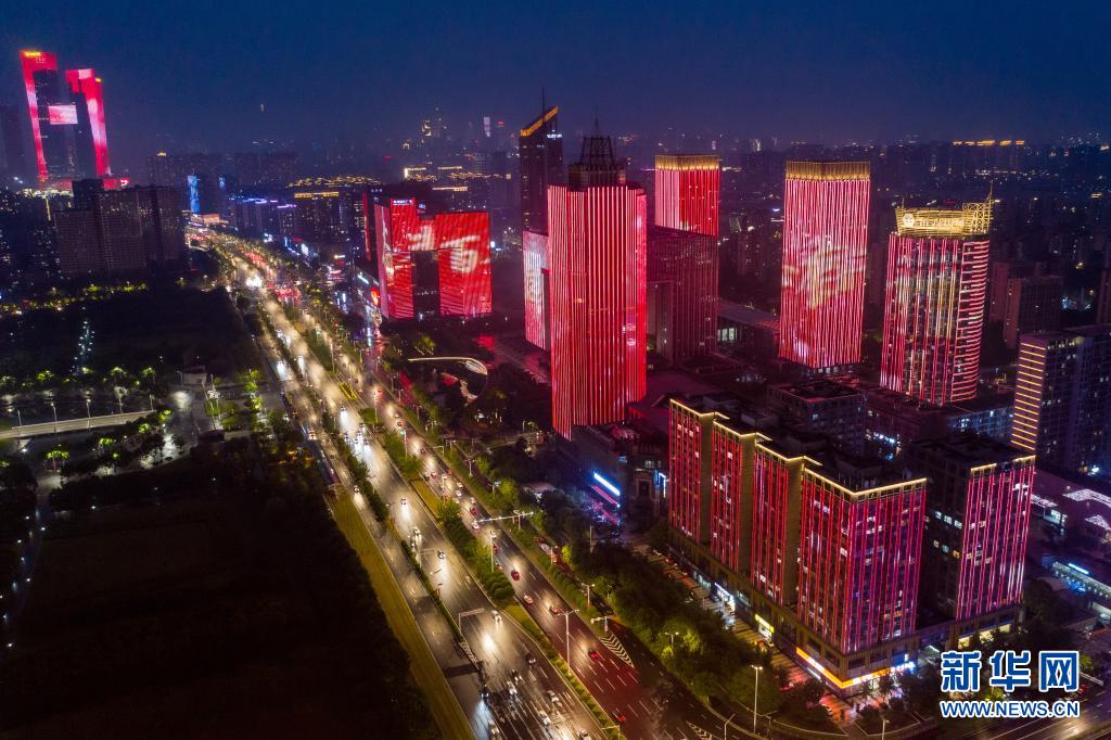 這是6月25日在南京市河西新城中軸線拍攝的慶祝建黨百年主題燈光秀(無人機(jī)照片)。新華社記者 李博 攝