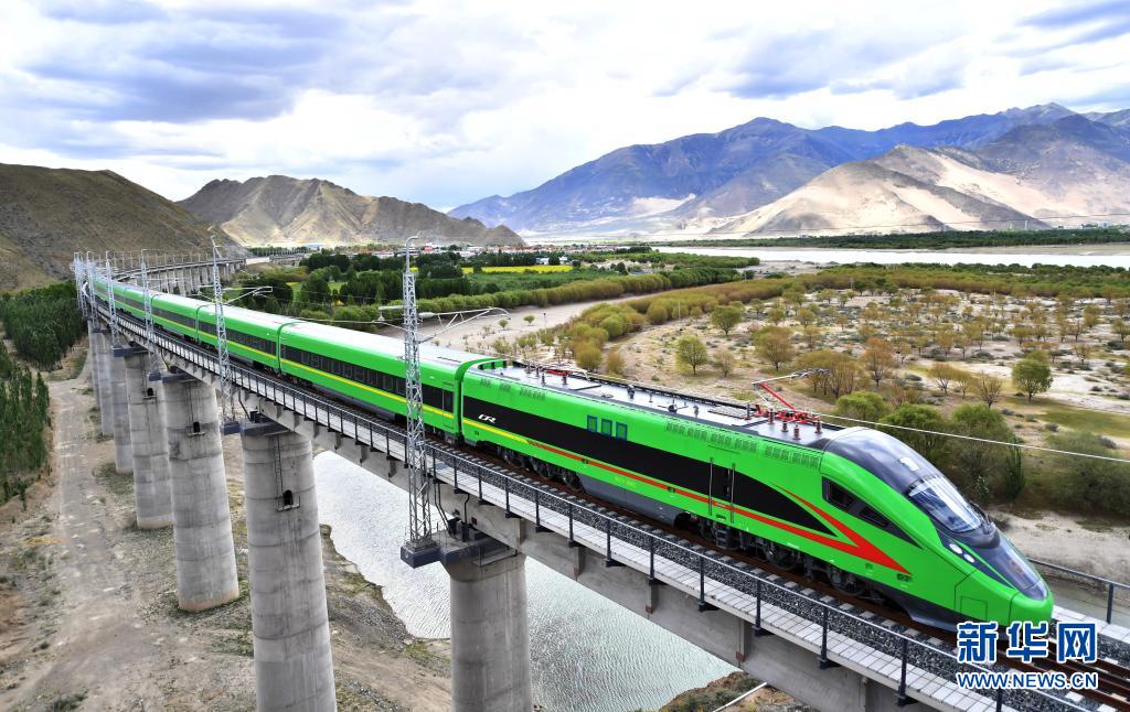 試運(yùn)行的復(fù)興號列車行駛在西藏山南市境內(nèi)(6月16日攝)。新華社記者 覺果 攝