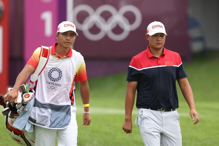 7月29日,中國選手袁也淳(右)在比賽中。當(dāng)天,東京奧運會高爾夫項目男子個人比桿賽在日本埼玉縣霞關(guān)鄉(xiāng)村俱樂部開賽。新華社記者 鄭煥松 攝