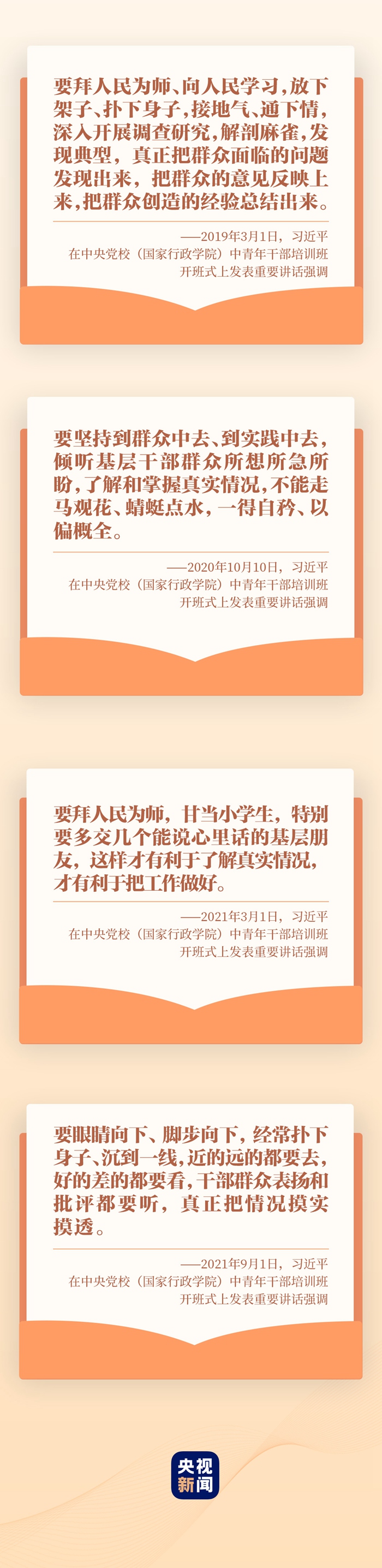 “堅持從群眾中來、到群眾中去,真正成為群眾的貼心人” “既要‘身入’基層,更要‘心到’基層”“掌握調查研究這個基本功”……2019年以來,習近平總書記在中青年干部培訓班開班式上多次要求干部拜人民為師,深入基層開展調查研究。