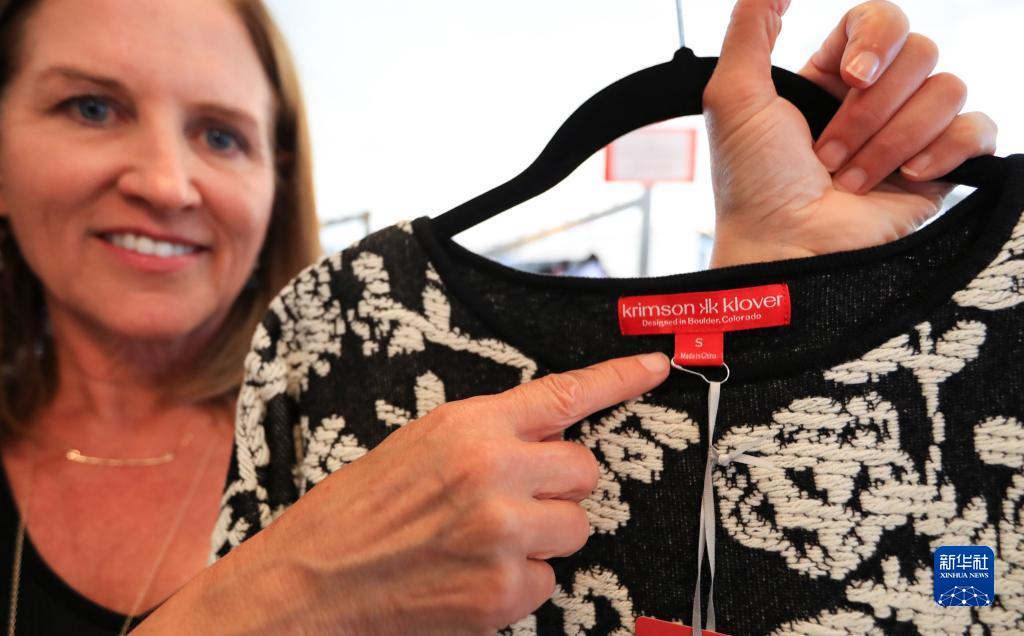 2019年9月12日,在美國科羅拉多州博爾德,克里姆森-克洛弗公司創(chuàng)始人兼首席執(zhí)行官朗達·斯溫森展示中國制造的衣服的標簽。新華社記者 李穎 攝