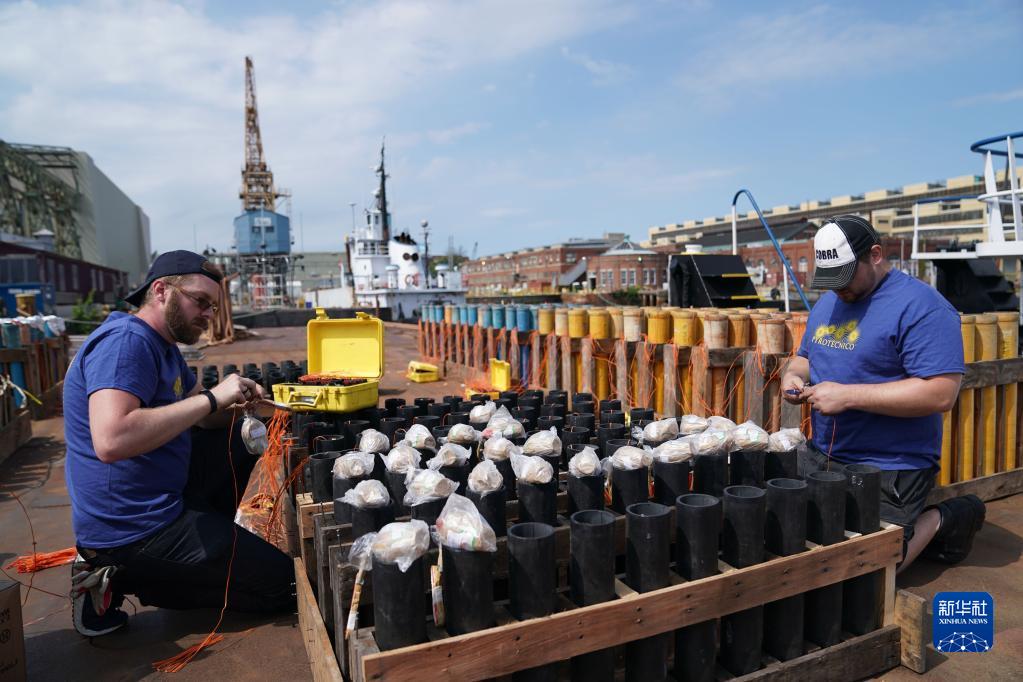 2019年5月25日,工作人員在美國賓夕法尼亞州費城一處碼頭安裝產(chǎn)自中國湖南瀏陽的煙花,為當晚美國陣亡將士紀念日的煙花表演做準備。新華社記者 劉杰 攝