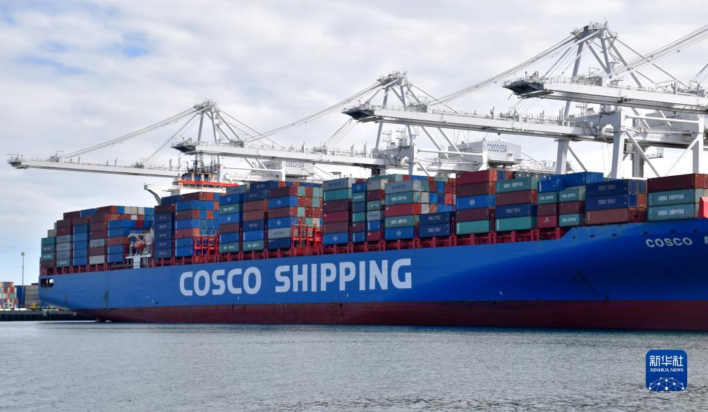 這是2019年2月27日在長灘港拍攝的一艘中國遠洋運輸集團(COSCO)的集裝箱貨輪。新華社記者 李穎 攝