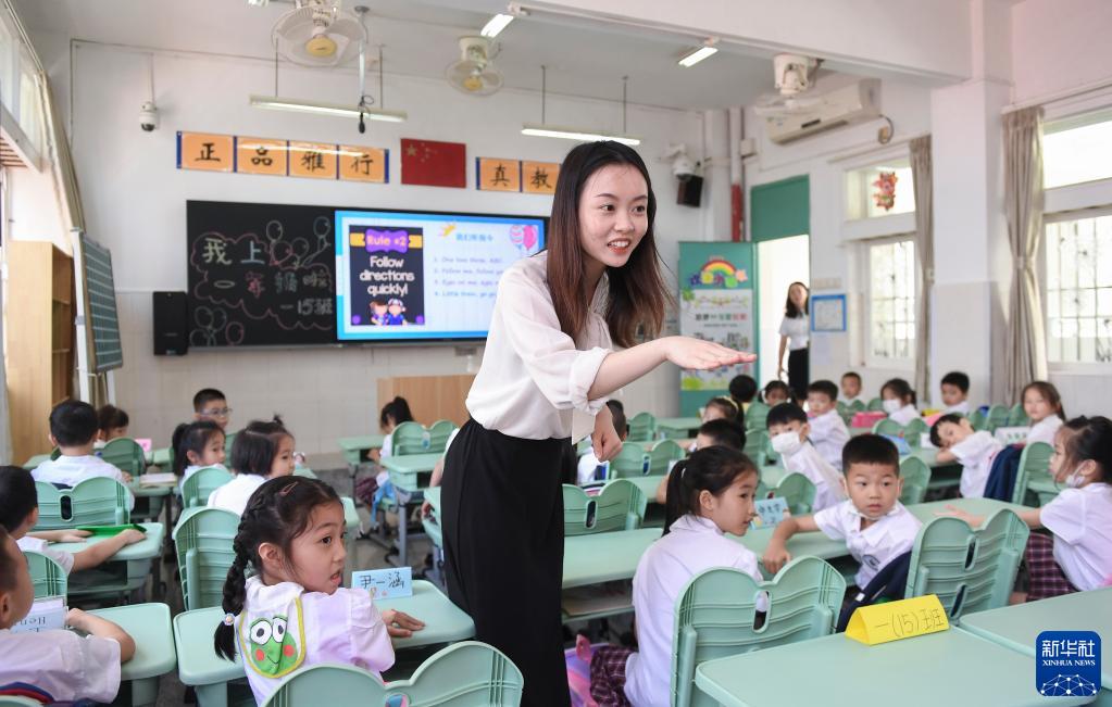 深圳市福田區(qū)南園小學(xué)教師、香港理工大學(xué)對(duì)外漢語(yǔ)教育專業(yè)碩士畢業(yè)的香港青年黃曉蕾在英語(yǔ)課上與孩子們互動(dòng)(9月1日攝)。新華社記者 毛思倩 攝