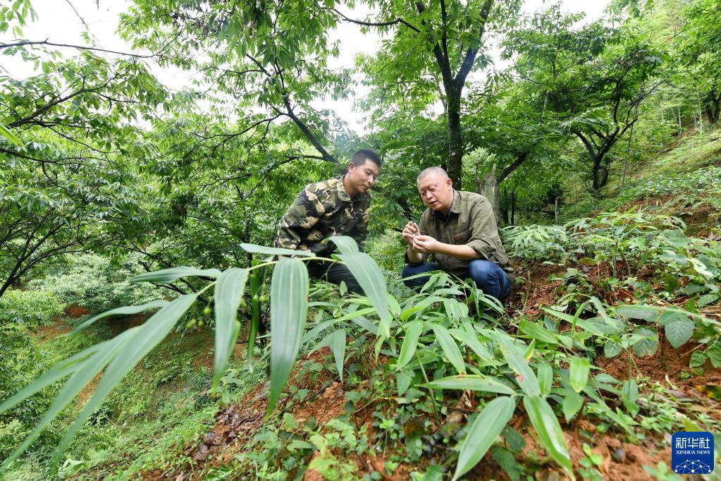 福建建甌市林權(quán)改革發(fā)展服務(wù)中心的科技特派員陳國(guó)興(右)在建甌市玉山鎮(zhèn)上房村一處林下種植園給村民講授中藥材栽培方法(5月28日攝)。新華社記者 林善傳 攝