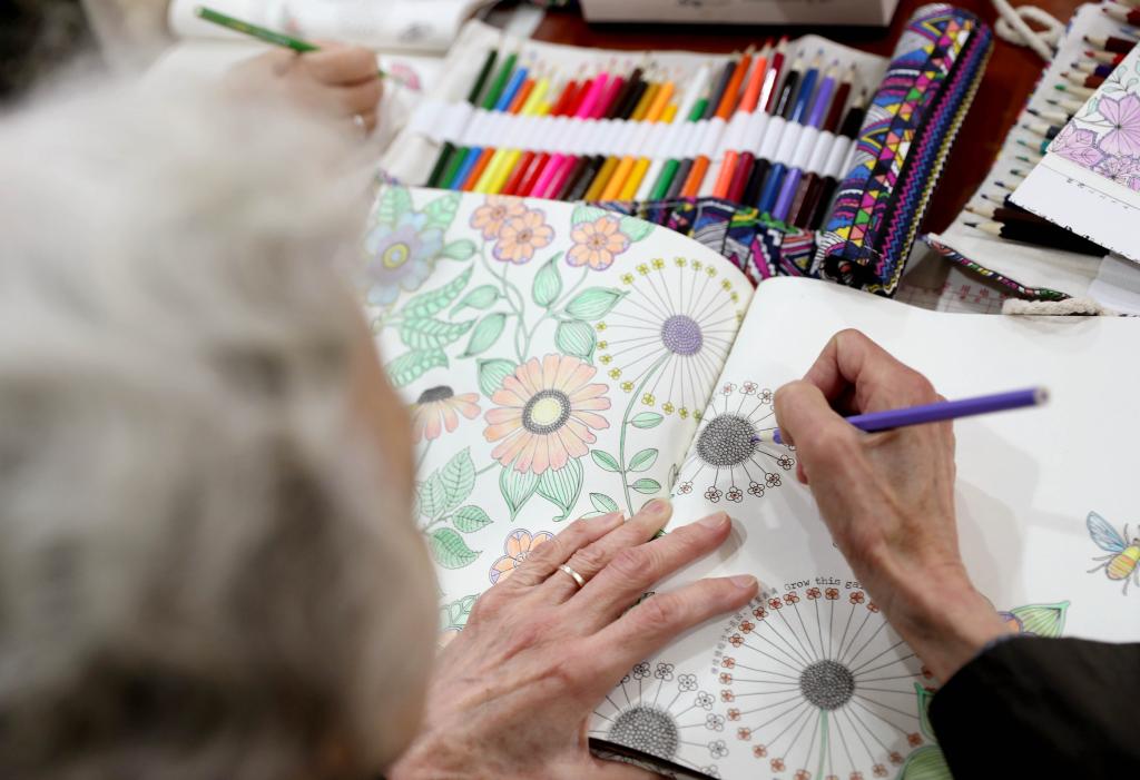 2020年11月,在上海市靜安區(qū)江寧路街道愛老家園,一位老年人在通過圖畫填色進行康復訓練(新華社記者劉穎 攝)
