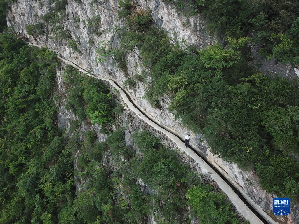 黃大發(fā)沿著修建在絕壁上的“大發(fā)渠”巡查(2018年8月11日攝,無人機(jī)照片)。新華社記者 劉續(xù) 攝