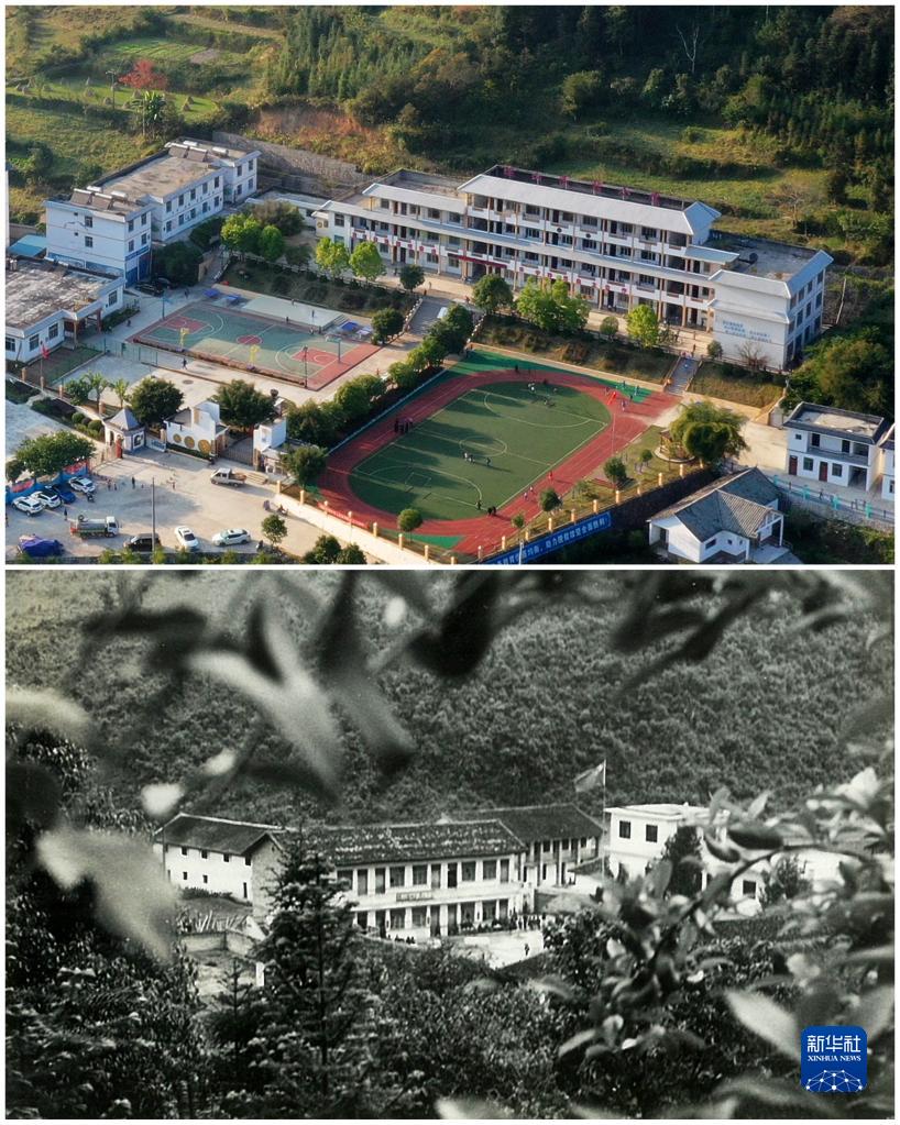 拼版照片:上圖為2019年11月5日拍攝的貴州省荔波縣瑤山民族小學(xué)新貌(無人機(jī)照片,新華社記者楊文斌攝);下圖為荔波縣瑤山民族小學(xué)舊貌(資料照片)。新華社發(fā)