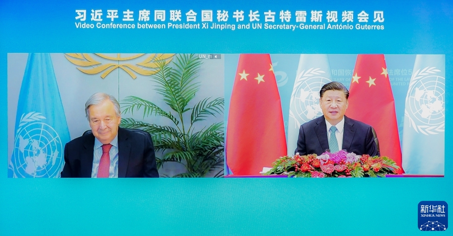 10月25日上午,國家主席習(xí)近平在北京人民大會(huì)堂以視頻方式會(huì)見聯(lián)合國秘書長(zhǎng)古特雷斯。新華社記者 翟健嵐 攝