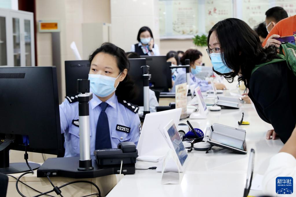 2020年10月14日,原籍浙江湖州的王秀麗(右)在上海市徐匯漕河涇社區(qū)事務(wù)受理服務(wù)中心公安綜合窗口辦理戶口遷移手續(xù),成為享受上海市公安局會同浙江省公安廳共同推出的滬浙“跨省市戶口網(wǎng)上遷移”便民措施的第一人。新華社記者 方喆 攝