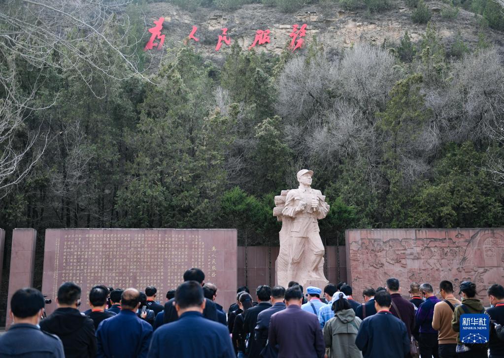 黨員干部在陜西省延安市張思德廣場進(jìn)行現(xiàn)場教學(xué)活動(3月29日攝)。新華社記者 張博文 攝
