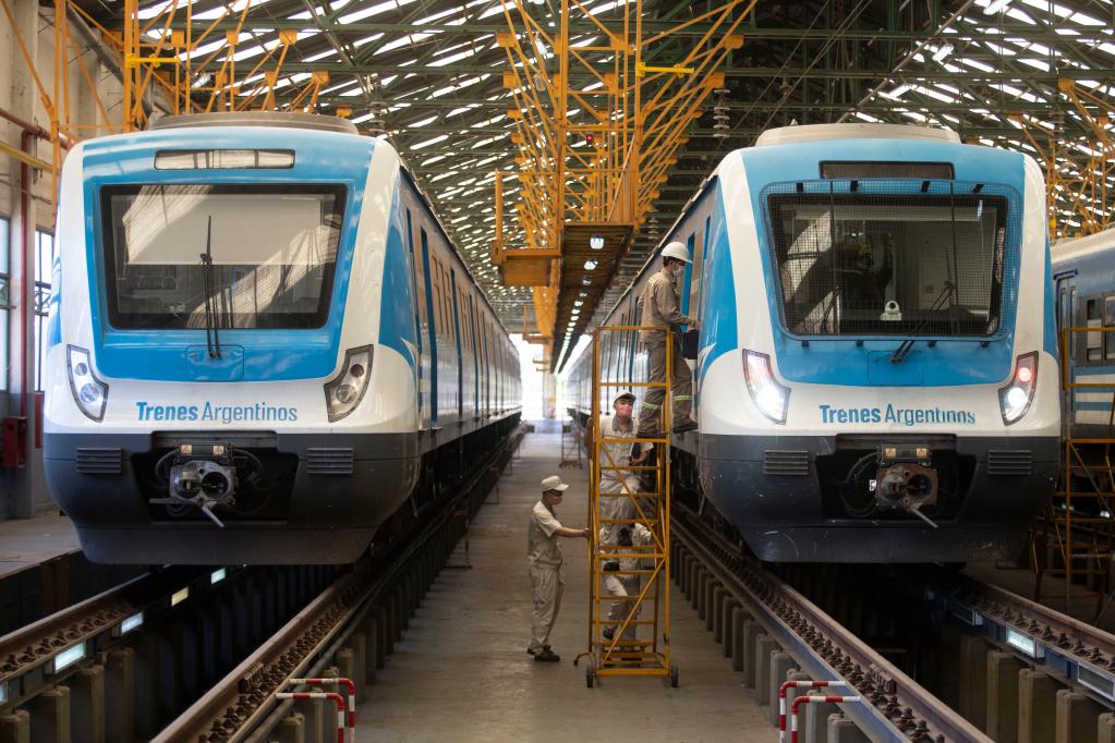 2020年11月16日,在布宜諾斯艾利斯省拉瓦約,中國和阿根廷技術(shù)人員對阿根廷城際鐵路列車進行日常檢查。