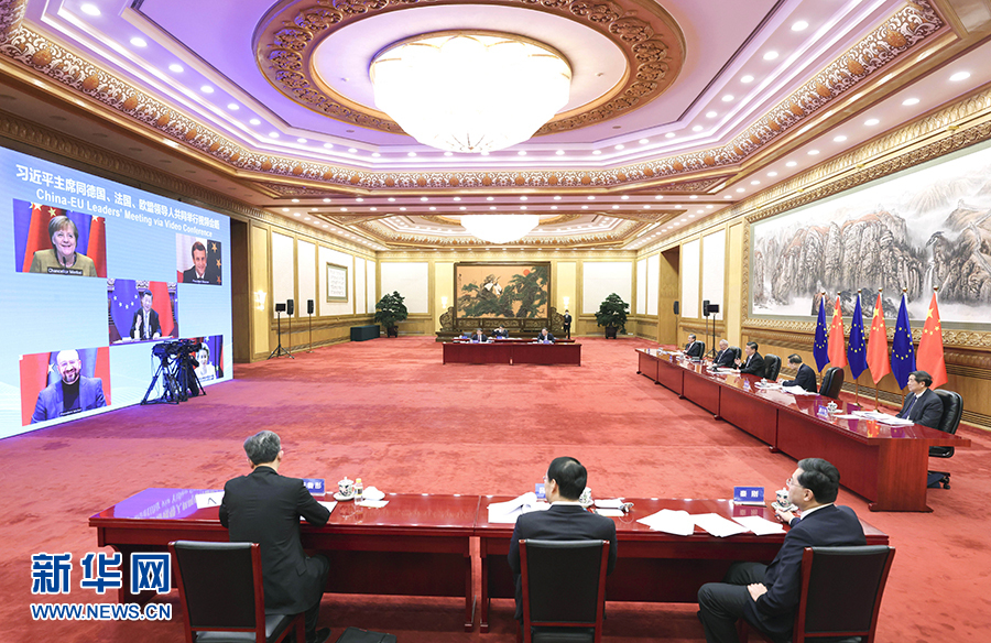 12月30日晚,國家主席習(xí)近平在北京同德國總理默克爾、法國總統(tǒng)馬克龍、歐洲理事會(huì)主席米歇爾、歐盟委員會(huì)主席馮德萊恩舉行視頻會(huì)晤。中歐領(lǐng)導(dǎo)人共同宣布如期完成中歐投資協(xié)定談判。 新華社記者 龐興雷 攝