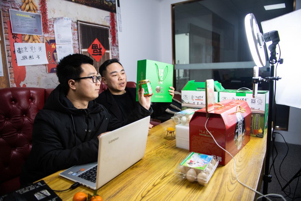 2022年2月22日,蔣連超(右)在湖南益陽市沅江高新技術產業(yè)園區(qū)與搭檔一起直播帶貨。新華社記者 陳思汗 攝