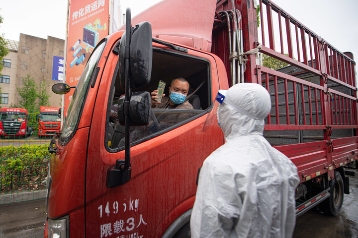 4月13日,工作人員查驗駛?cè)牒贾輦骰犯鄣呢涇囁緳C健康碼。新華社記者江漢 攝
