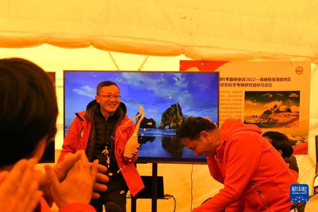 在珠峰腳下海拔5200米的總指揮會議室?guī)づ窭铮蠹覠崃覒c祝“巔峰使命”珠峰科考登頂觀測采樣成功(5月4日攝)。新華社記者 姜帆 攝