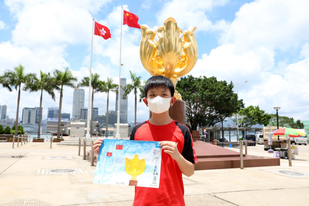 香港小學(xué)生曾祥珂帶著自己的畫作《敬禮——慶祝香港回歸25周年》,在父母陪伴下來到金紫荊廣場(chǎng)留影,迎接香港回歸25周年。新華社記者 吳曉初 攝