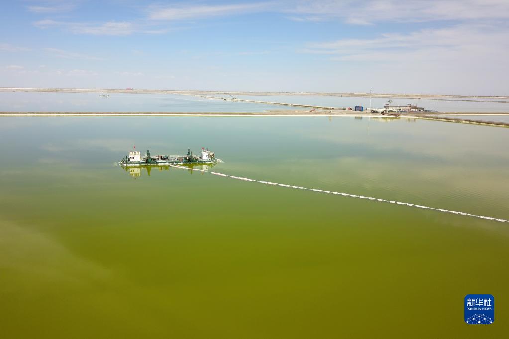 這是2022年6月13日在青海柴達(dá)木盆地拍攝的察爾汗鹽湖上的采鹽船(無人機照片)。新華社記者 范培珅 攝