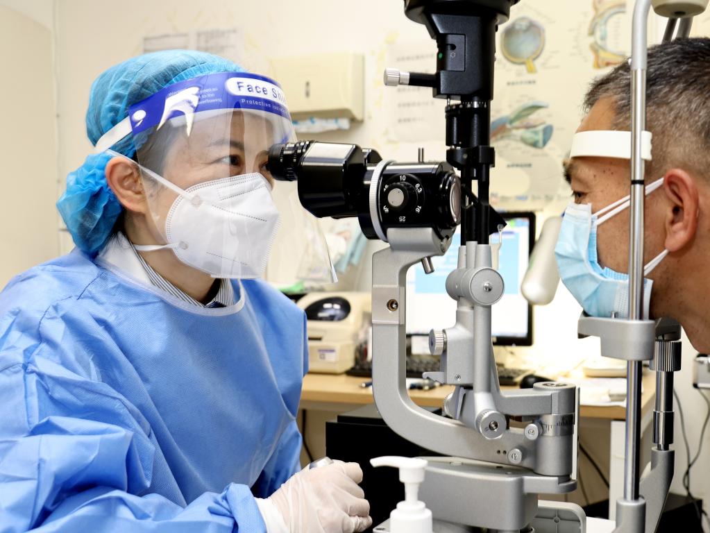 資料圖:上海市第十人民醫(yī)院眼科主任醫(yī)師鄒俊(左)為患者檢查。新華社記者 陳建力 攝