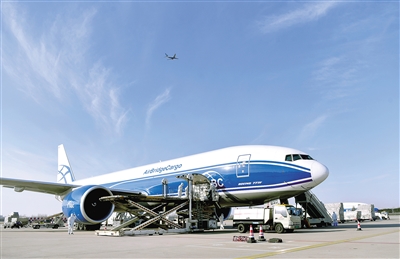 鄭州新鄭國(guó)際機(jī)場(chǎng)工作人員在為一架俄羅斯空橋貨運(yùn)航空公司貨機(jī)裝貨 新華社發(fā)