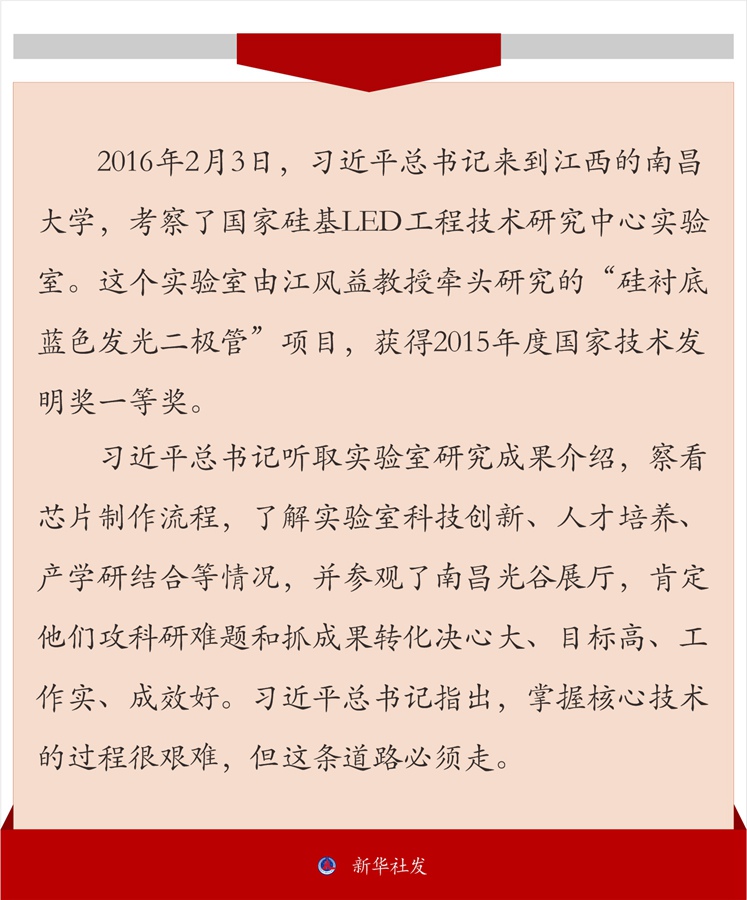 習近平總書記聽取實驗室研究成果介紹,察看芯片制作流程,了解實驗室科技創(chuàng)新、人才培養(yǎng)、產學研結合等情況,并參觀了南昌光谷展廳,肯定他們攻科研難題和抓成果轉化決心大、目標高、工作實、成效好。習近平總書記指出,掌握核心技術的過程很艱難,但這條道路必須走。