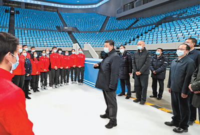 首都體育館是國(guó)內(nèi)第一座人工室內(nèi)冰場(chǎng),經(jīng)過(guò)改擴(kuò)建已具備冬奧會(huì)短道速滑和花樣滑冰比賽訓(xùn)練條件。習(xí)近平走到訓(xùn)練場(chǎng)邊,察看場(chǎng)館改造情況,同國(guó)家花樣滑冰隊(duì)和短道速滑隊(duì)運(yùn)動(dòng)員、教練員代表親切交流。習(xí)近平指出,建設(shè)體育強(qiáng)國(guó),是全面建設(shè)社會(huì)主義現(xiàn)代化國(guó)家的一個(gè)重要目標(biāo)。體育強(qiáng)國(guó)的基礎(chǔ)在于群眾體育。要通過(guò)舉辦北京冬奧會(huì)、冬殘奧會(huì),推動(dòng)我國(guó)冰雪運(yùn)動(dòng)跨越式發(fā)展,補(bǔ)缺項(xiàng)、強(qiáng)弱項(xiàng),逐步解決競(jìng)技體育強(qiáng)、群眾體育弱和“夏強(qiáng)冬弱”、“冰強(qiáng)雪弱”的問(wèn)題,推動(dòng)新時(shí)代體育事業(yè)高質(zhì)量發(fā)展。提高現(xiàn)代競(jìng)技體育水平,既要靠氣力,也要靠技力。運(yùn)動(dòng)員要有為國(guó)爭(zhēng)光、勇創(chuàng)佳績(jī)的志氣,夏練三伏、冬練三九,加強(qiáng)技術(shù)創(chuàng)新,學(xué)習(xí)借鑒國(guó)外先進(jìn)理念和技術(shù),不斷提高訓(xùn)練和比賽水平。