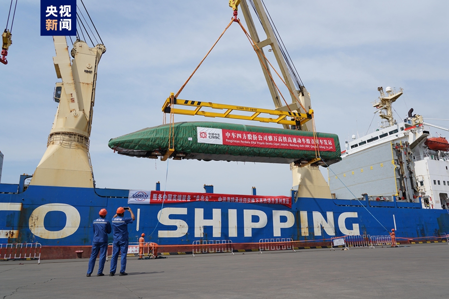 ? ?8月21日,我國出口印尼用于雅萬高鐵的1組高速動(dòng)車組和1組綜合檢測(cè)列車在青島港順利完成裝船,通過海運(yùn)發(fā)往印尼。這是雅萬高鐵首批發(fā)運(yùn)列車,標(biāo)志著我國首次出口國外的高鐵列車正式啟運(yùn)。