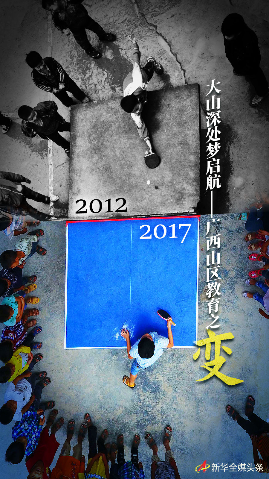 拼版照片:上圖為在廣西大化瑤族自治縣板升鄉(xiāng)弄勇小學(xué),孩子們在打乒乓球(2017年9月4日攝,無人機(jī)照片);下圖為在弄勇小學(xué),孩子們在打乒乓球(2012年12月26日攝)。新華社記者 黃孝邦 攝