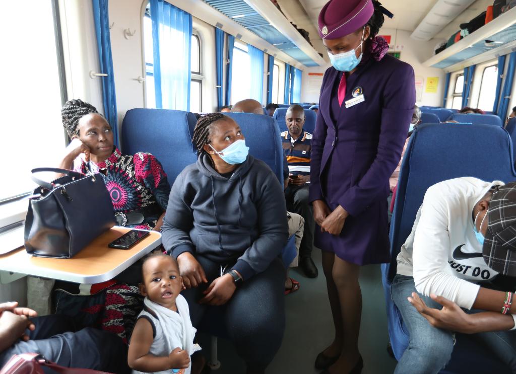 7月29日,列車員菲奧娜(站立者)在蒙內(nèi)鐵路客運列車上與乘客交流。新華社記者董江輝攝