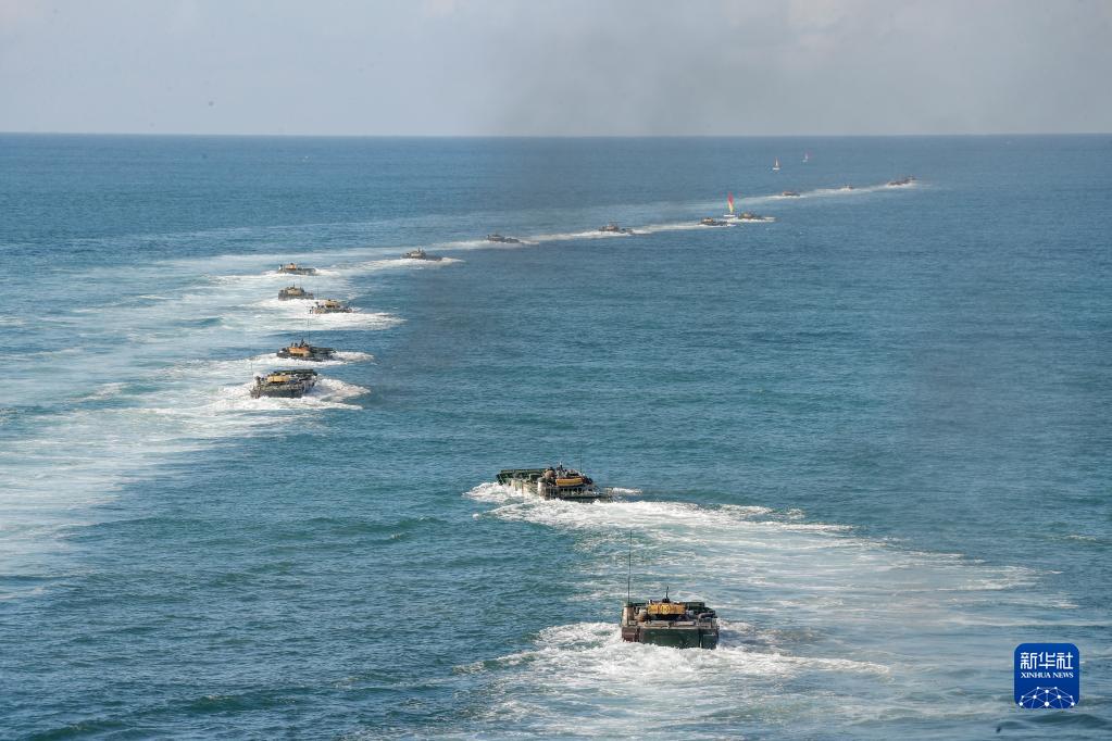 陸軍第74集團軍某合成旅兩棲裝甲車進行海上泛水編波訓(xùn)練(2020年8月14日攝)。新華社發(fā)(李彬 攝)