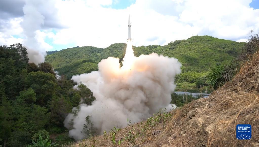 東部戰(zhàn)區(qū)火箭軍對臺島東部外海預(yù)定海域?qū)嵤┗鹆ν粨簟_@是導(dǎo)彈發(fā)射升空(2022年8月4日,視頻截圖)。新華社發(fā)