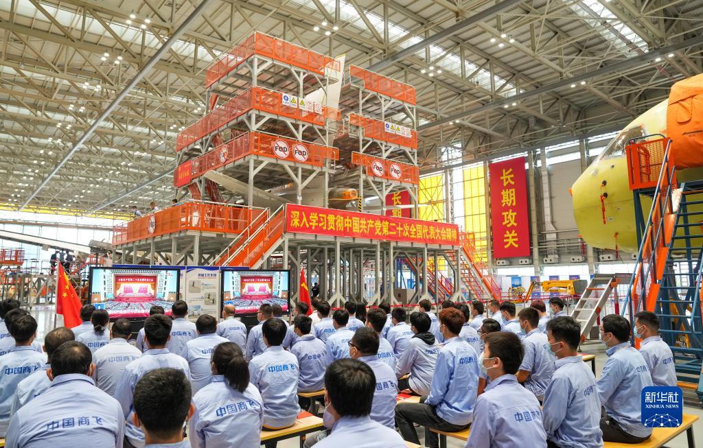 10月16日,在中國商飛上海飛機制造有限公司總裝車間,員工們在收看中國共產黨第二十次全國代表大會開幕會。新華社記者 丁汀 攝