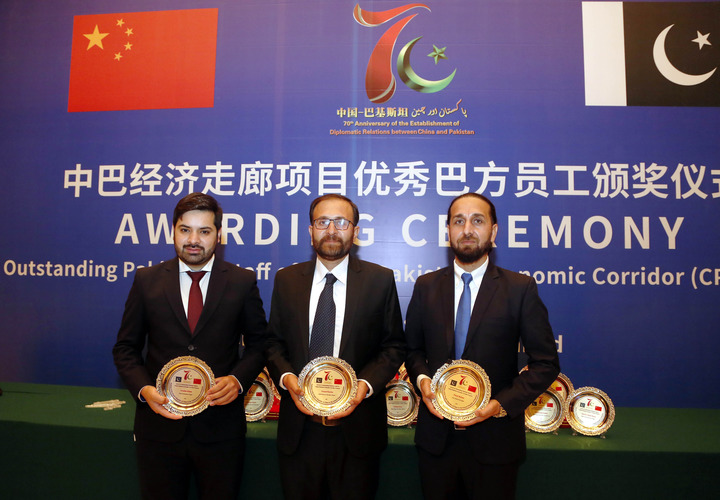 2021年12月29日,優(yōu)秀員工代表在巴基斯坦伊斯蘭堡舉行的中巴經(jīng)濟(jì)走廊項(xiàng)目?jī)?yōu)秀巴基斯坦員工頒獎(jiǎng)儀式上合影。