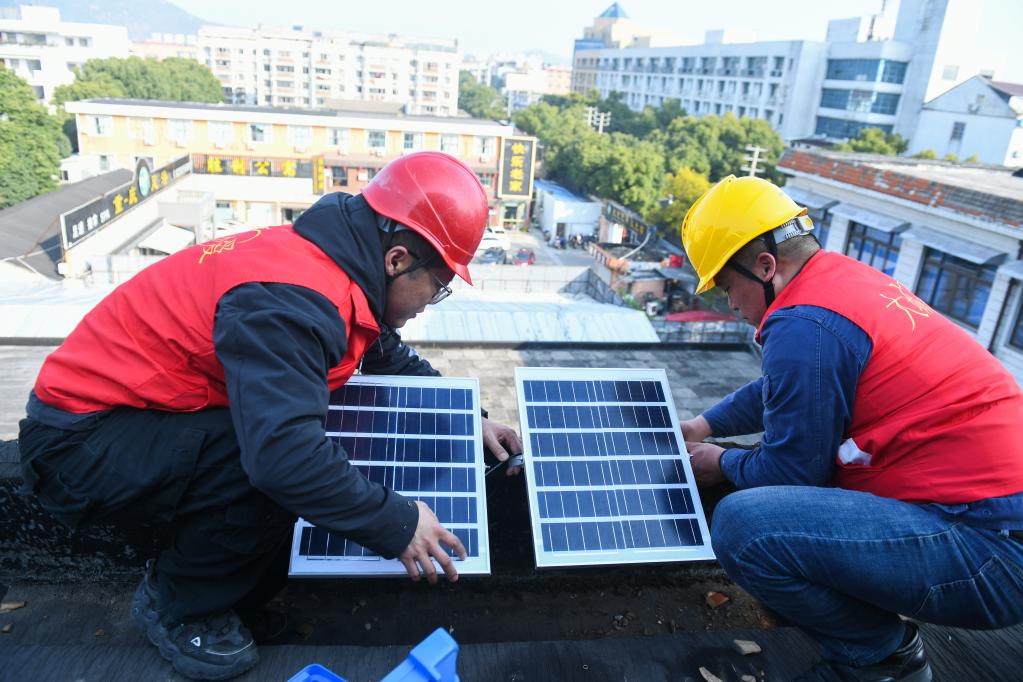 2023年2月20日,浙江余姚市大城小愛公益服務中心的志愿者為老舊小區(qū)安裝光伏發(fā)電板。新華社記者徐昱 攝