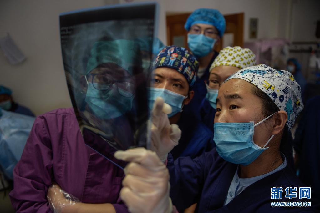 在西藏拉薩市人民醫(yī)院內(nèi),首都兒科研究所的援藏醫(yī)生韓同英(右一)進(jìn)行教學(xué)查房時(shí),與當(dāng)?shù)蒯t(yī)生們一起研究入院新生兒胸片(2020年8月3日攝)。新華社記者 彭子洋 攝