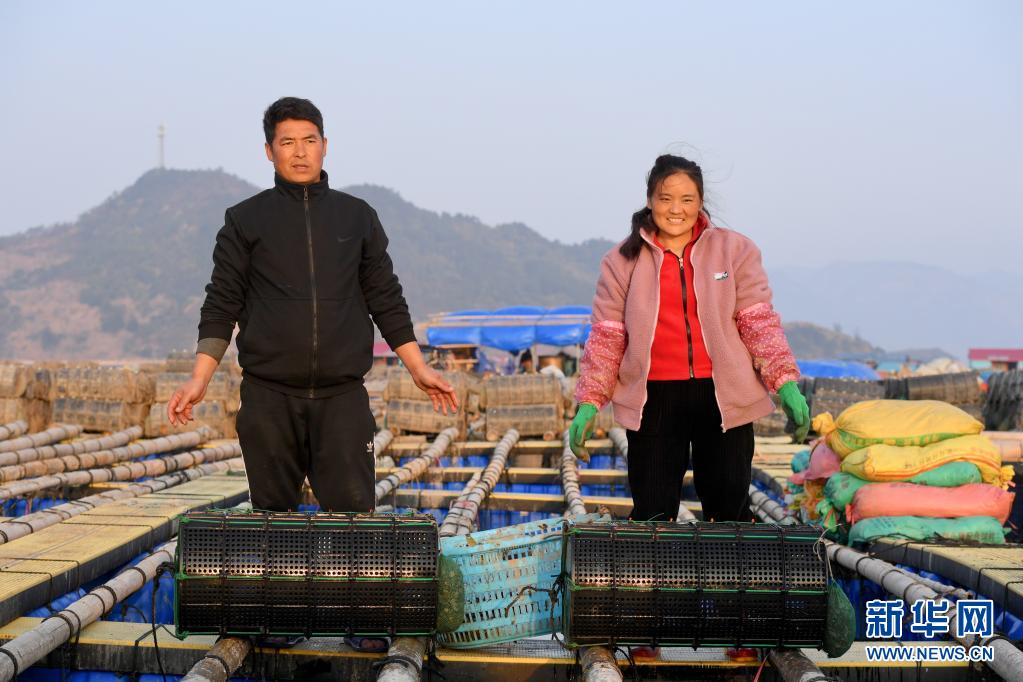 “春運(yùn)母親”巴木玉布木與丈夫巫其石且從四川涼山彝族自治州老家輾轉(zhuǎn)來到福建省霞浦縣溪南鎮(zhèn)海域,從事海上漁排海參養(yǎng)殖。這是2月4日在漁排上拍攝的巴木玉布木(右)與丈夫巫其石且。新華社記者 姜克紅 攝