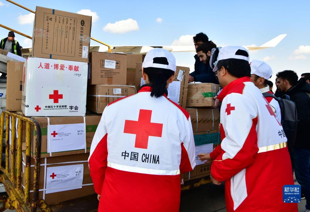 工作人員在敘利亞大馬士革國際機場卸載中國紅十字會援助的人道主義物資(2023年2月13日攝)。新華社發(fā)(阿馬爾·薩法爾賈拉尼攝)