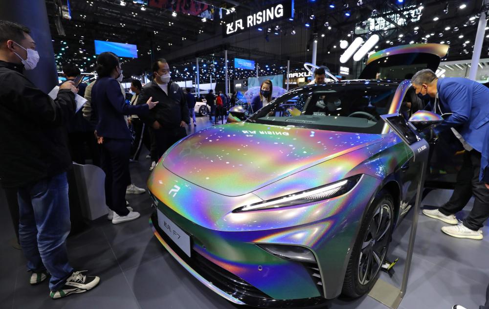4月24日,參觀者在2023第二十屆上海國際汽車工業(yè)展覽會飛凡F7展車邊駐足觀看。新華社記者 方喆 攝