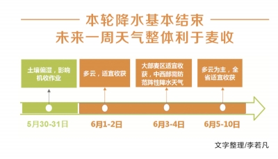這輪降雨對麥種的品質(zhì)有多大影響?“有影響,但影響不大。”白晶解釋,為了預(yù)防可能出現(xiàn)的極端天氣,種麥時就平均種了4個品種小麥,其中兩個是正常熟的,兩個是晚熟的。正常熟的大部分在5月28日搶收了,晚熟的6月5日以后才能收割。