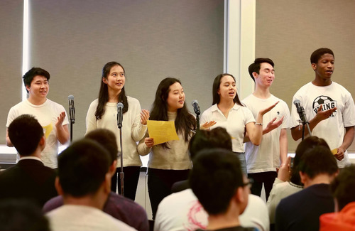 2019年4月3日,在美國伊利諾伊州北奈爾斯市,北奈爾斯高中的學(xué)生們現(xiàn)場中文朗誦唐代詩人李白的《靜夜思》和孟浩然的《春曉》。