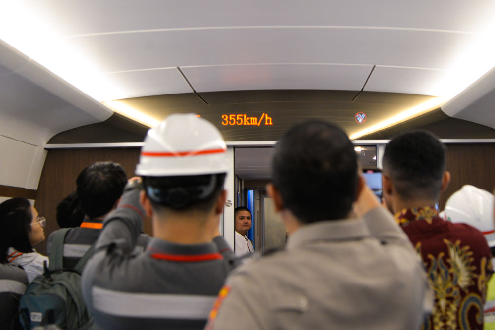 6月22日,印度尼西亞雅萬高鐵聯(lián)調(diào)聯(lián)試綜合檢測列車運行時速首次達到350公里。這是記者和工作人員拍攝顯示列車時速的電子屏。新華社記者 徐欽 攝