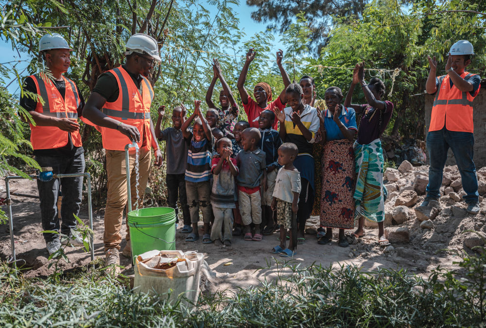 6月13日,在坦桑尼亞姆萬扎省米松圭,中土東非有限公司員工接通水管后贏得當?shù)鼐用窆恼茪g呼。新華社記者 王冠森 攝