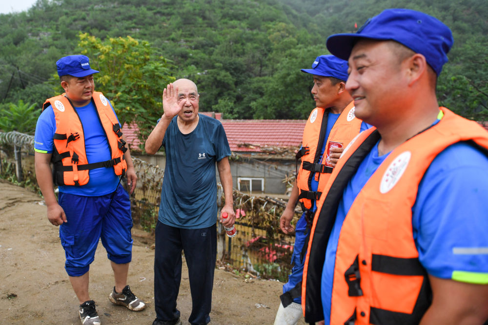 8月1日,在北京市門頭溝區(qū)水峪嘴村,一名87歲的村民向助他脫困的河北秦皇島獵豹救援隊(duì)隊(duì)員表示感謝。新華社記者 鞠煥宗 攝